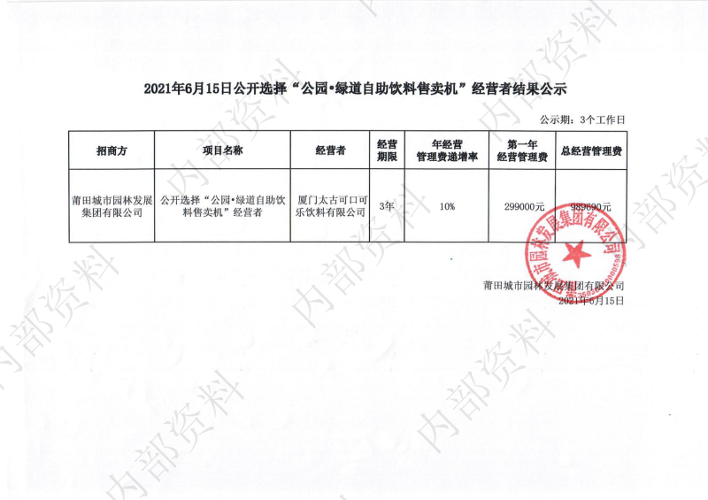 2021年6月15日公開選擇“公園?綠道自助飲料售賣機”經(jīng)營者結(jié)果公示